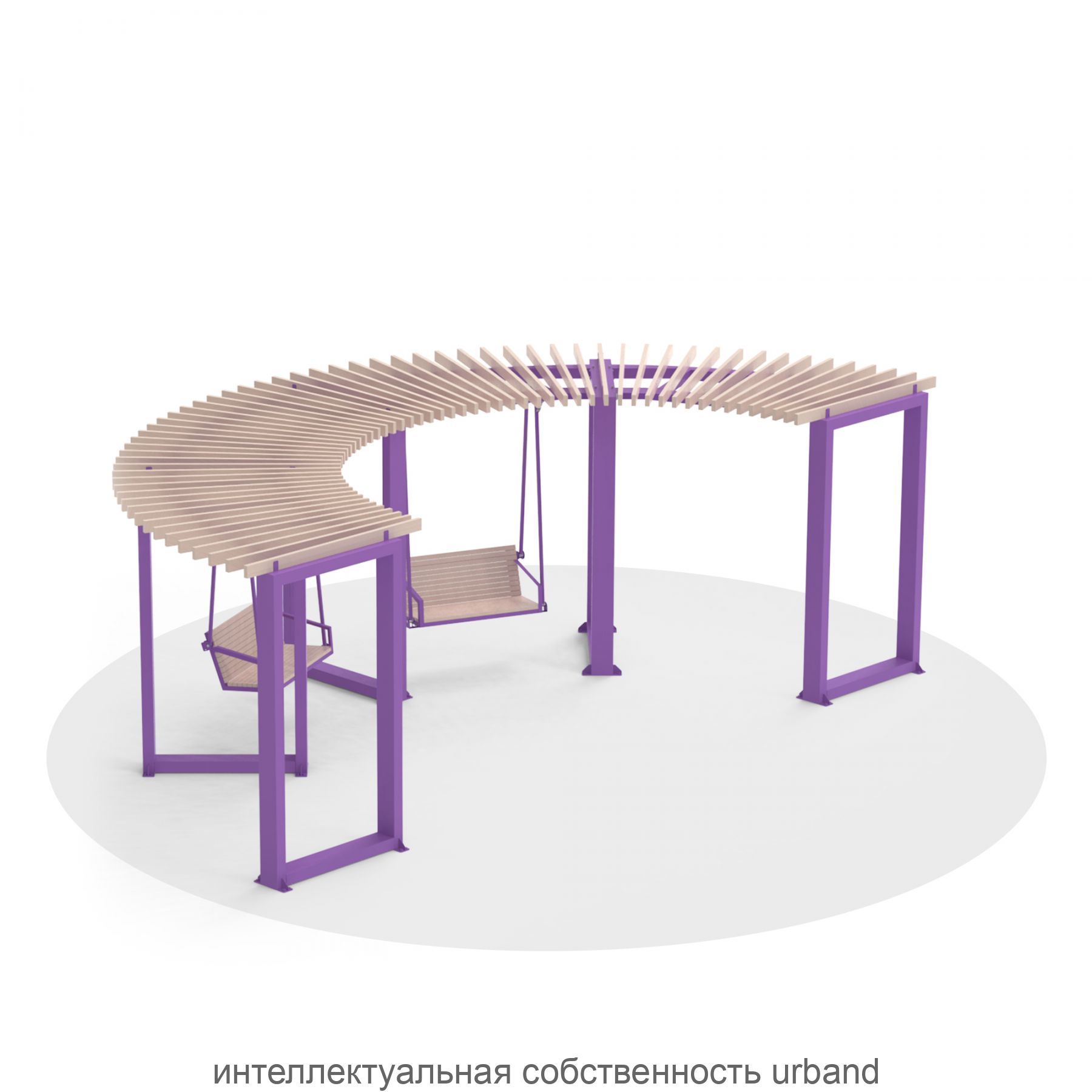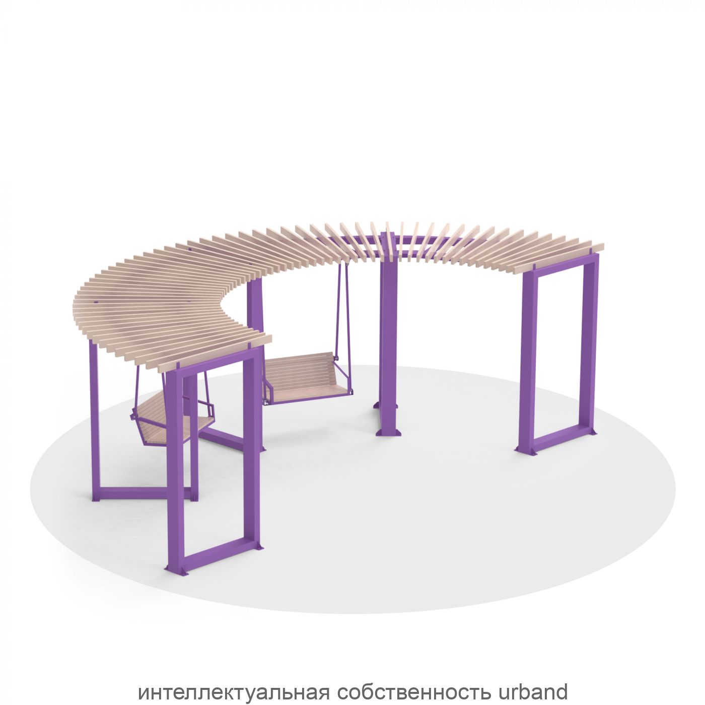 Радиальный навес с мощным каркасом и двумя скамьями на подвесах. Создает комфортную и обширную теневую зону, оформляя пространство.