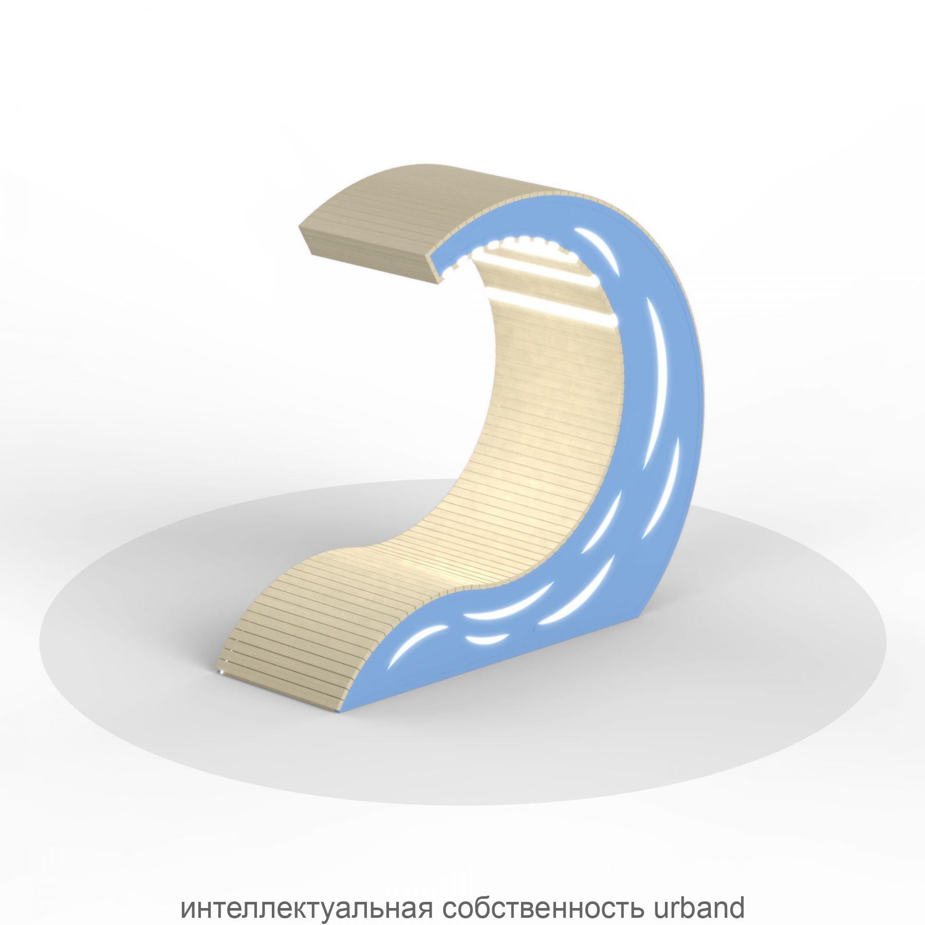 Шезлонги "Волнорез" создают уединенные зоны отдыха с деревянным покрытием и отдельным верхним освещением. Они оснащены зарядными устройствами и декоративной подсветкой по бокам.