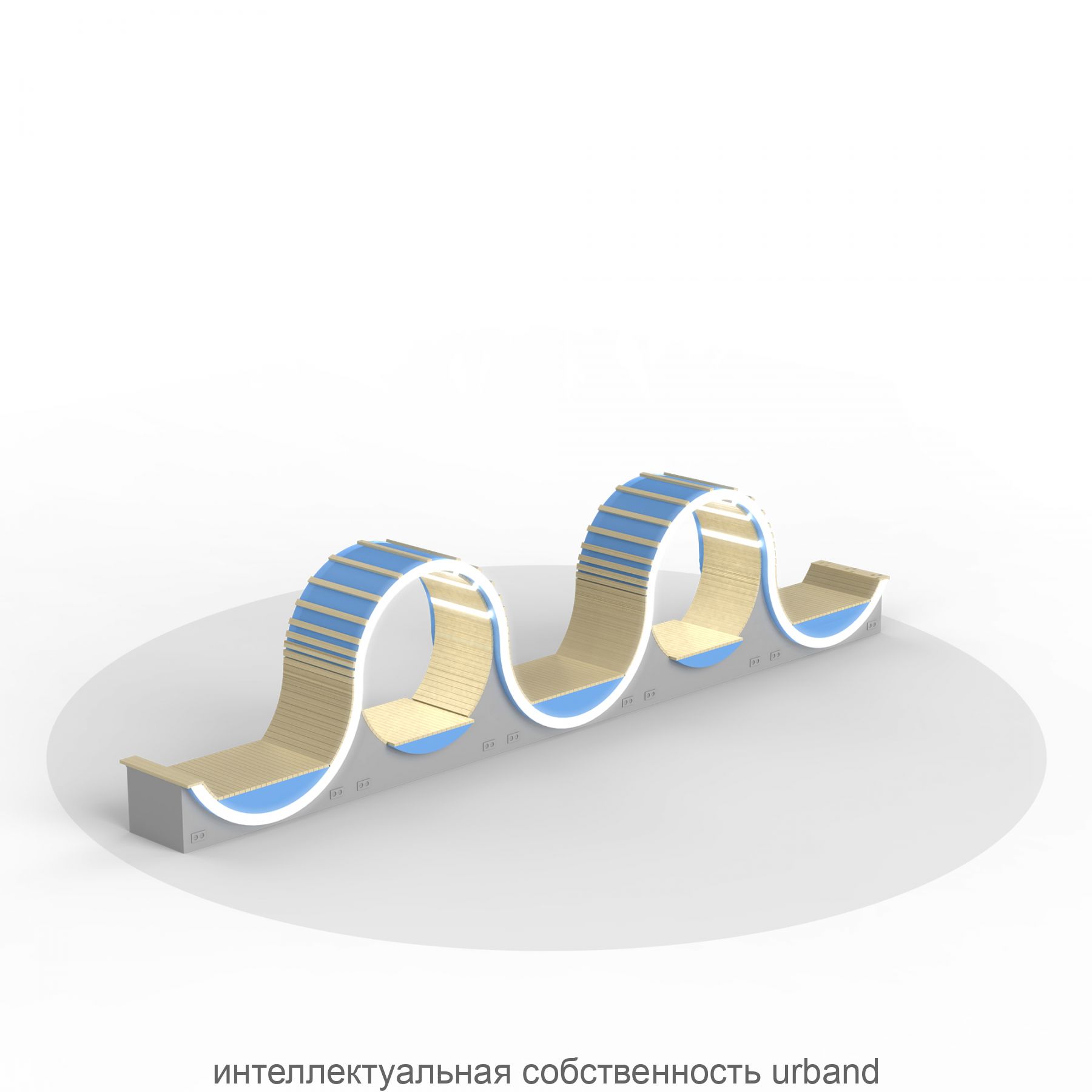 Эти модульные скамьи "Волны", составленные вместе, образуют единую длинную "волну" с отдельными зонами отдыха. Они облицованы деревом и имеют дополнительное верхнее освещение. Скамьи оснащены розетками для зарядки устройств и декоративную радиальную подсветку на боковых сторонах.